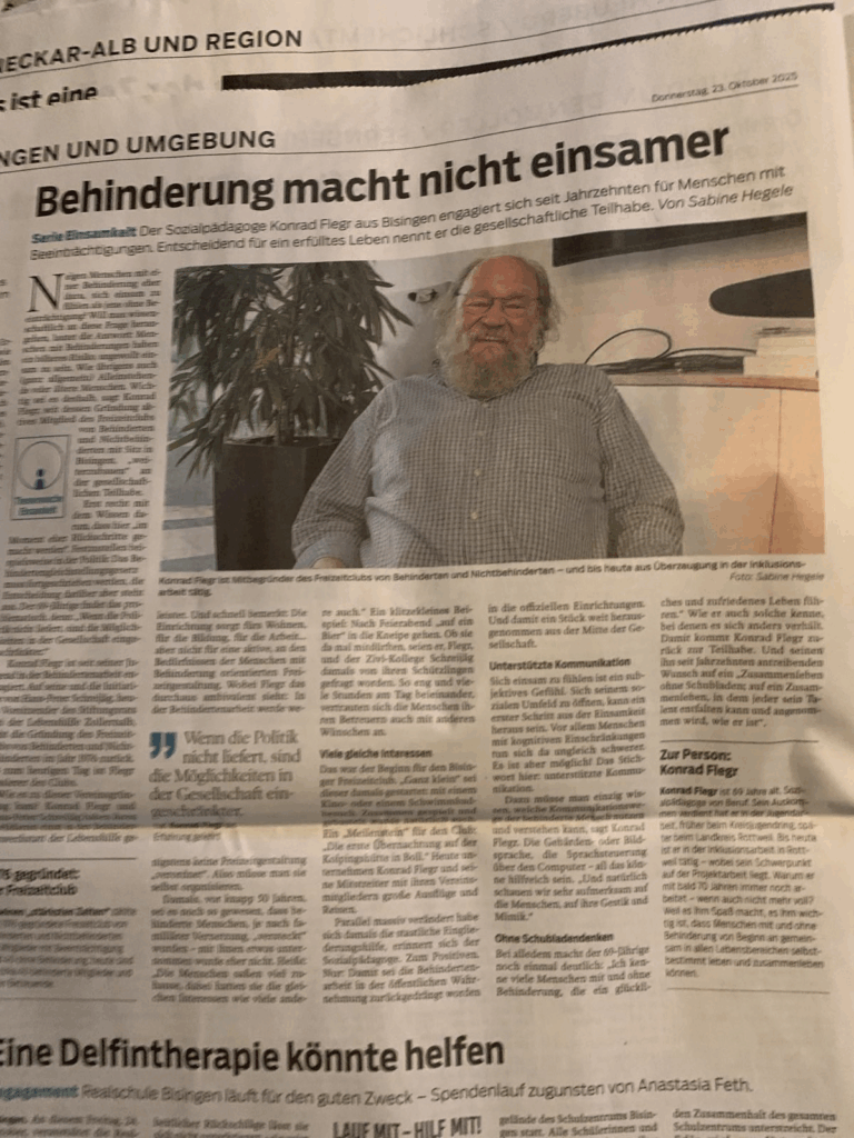 Einsamkeit betrifft viele Menschen – besonders jene, die mit einer Behinderung leben. Wie wichtig gesellschaftliche Teilhabe und gemeinsames Erleben sind, zeigt ein Beitrag der Südwest Presse (swp.de) über das Engagement von Konrad Flegr und den Freizeitclub von Behinderten und Nichtbehinderten in Bisingen.