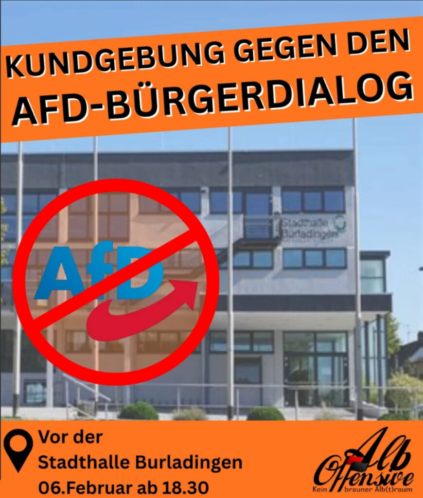 Am Freitag, den 06.02.2025, veranstaltet die Alb-Offensive eine Kundgebung gegen den sogenannten „AfD-Bürgerdialog“.