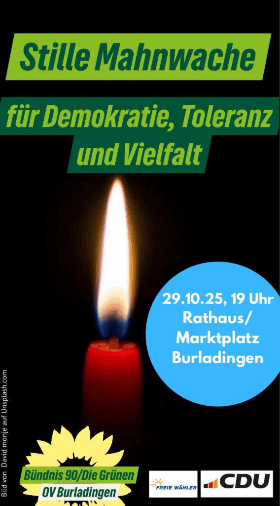 Der Ortsverband der Grünen in Burladingen lädt herzlich zur kommenden Mahnwache auf dem Marktplatz ein. Gemeinsam möchten wir ein deutliches Zeichen für Demokratie, Toleranz und gelebte Vielfalt setzen.