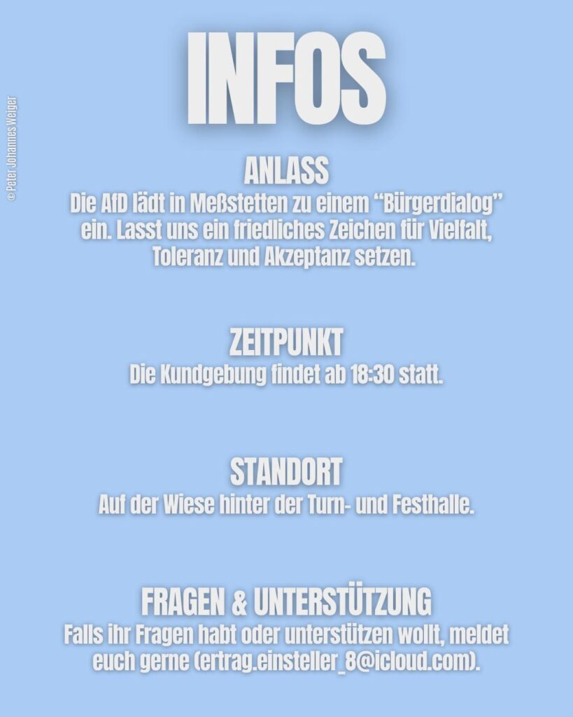 Die AfD lädt in Meßstetten zu einem „Bürgerdialog“ ein. Lasst uns ein friedliches Zeichen für Vielfalt, Toleranz und Akzeptanz setzen.