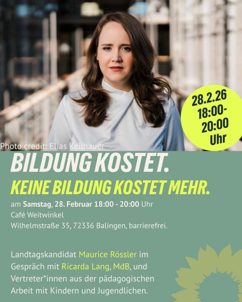 Zum Gespräch „Bildung kostet. Keine Bildung kostet mehr.“ hat der grüne Landtagskandidat Maurice Rössler die Bundestagsabgeordnete Ricarda Lang für Samstag, den 28. Februar eingeladen. Fragen nach Chancen, unabhängig von Herkunft und Geldbeutel, und die konkreten Herausforderungen im Alltag sollen mit Vertreter*innen aus der pädagogischen Arbeit mit Kindern und Jugendlichen diskutiert werden.